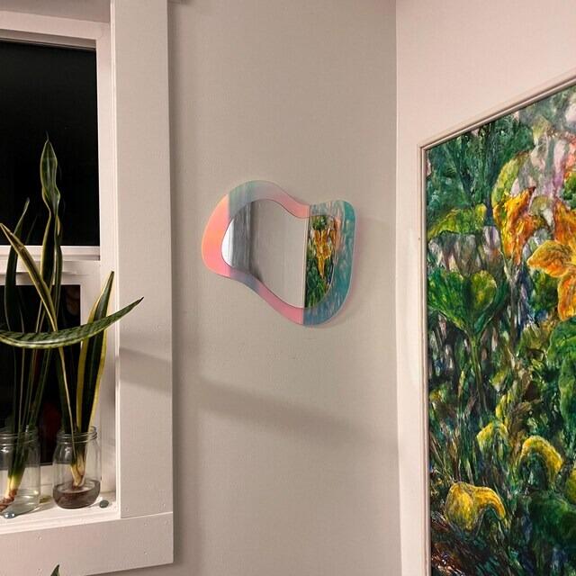 This layered mirror and iridescent acrylic wall art is bold, fun, and totally unique — the perfect piece to brighten your gallery wall, office, locker, or even your fridge. The combination of high-shine mirror acrylic and shifting iridescent tones creates a dazzling, light-catching effect that changes as you move, making it a true statement piece in any room.